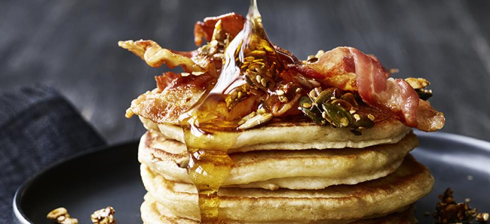 Til pandekager blandes mel med sukker, bagepulver, æg og smeltet smør til en lind dej.