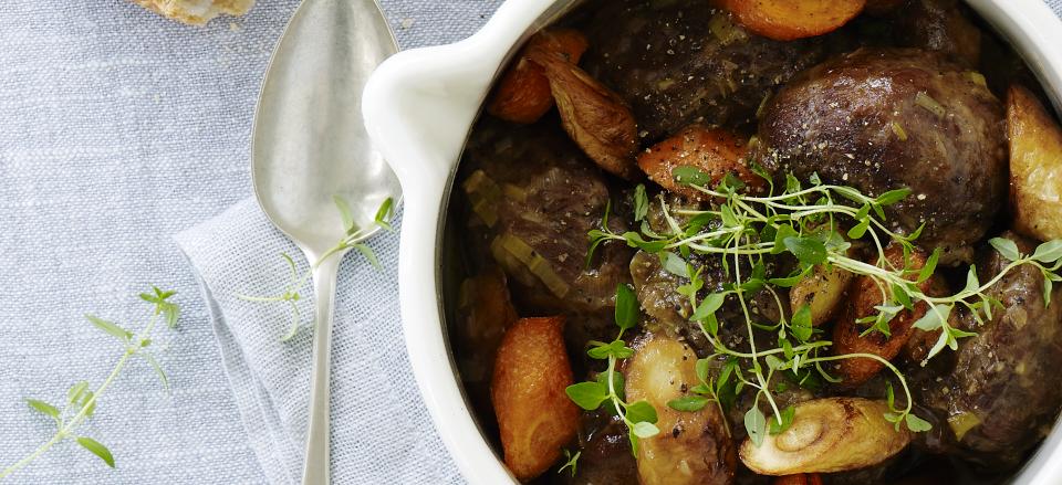 Ølbraiserede kæber af gris med rodfrugter