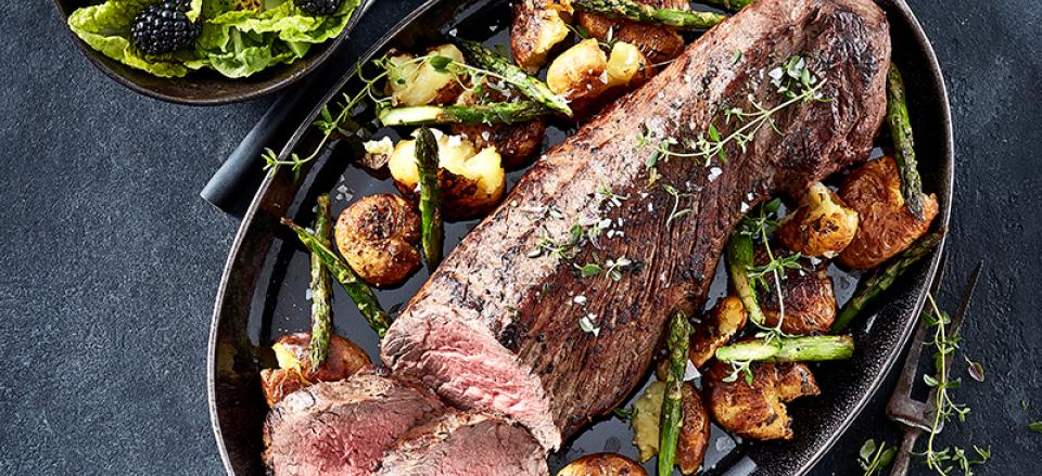 Anret skiver af oksemørbrad med kartofler og asparges på et fad.