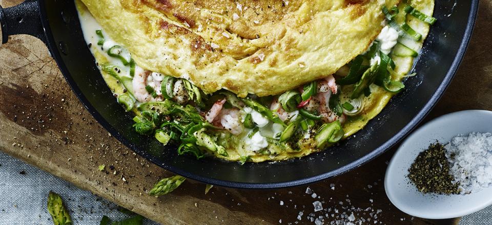 Omelet med hytteost, rejer, forårsløg og asparges
