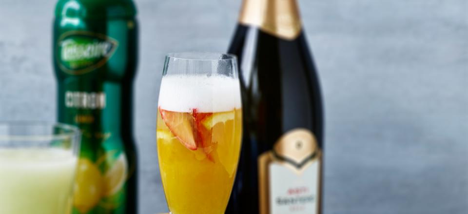 Kom isterninger, stykker af jordbær og appelsin i glasset og afslut med Spumante.