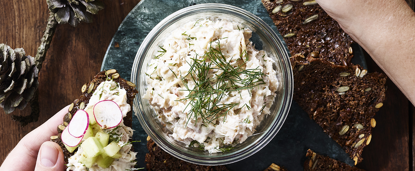 Kom rilletten på ristet rugbrød, og top med agurkesalaten og lidt ekstra dild.