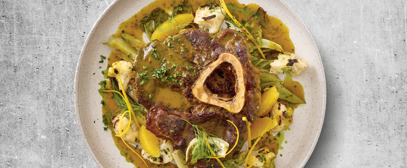 Anret kødet og grøntsagerne på passende tallerkner og pynt med stykker af appelsin.