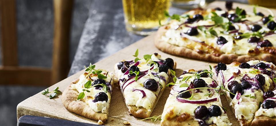 Skær rødløget i tynde strimler og læg på sammen med blåbær.
