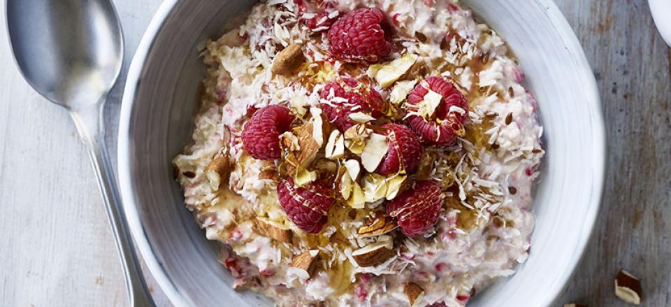 Server med resten af hindbærrene, hakkede mandler, kokosmel og honning.