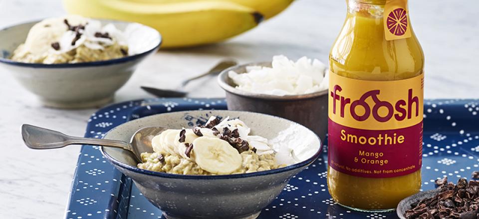 Server pyntet med bananskiver, kokos og evt. kakaonibs.