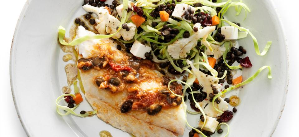 Ovnbagt kulmule med blomkål og beluga linse salat