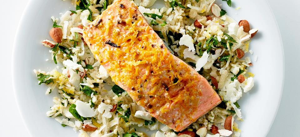 Bland revet blomkål, med parmesanost, hakkede mandler, skal og saft af usprøjtet citron, fuldkornsris og olivenolie.