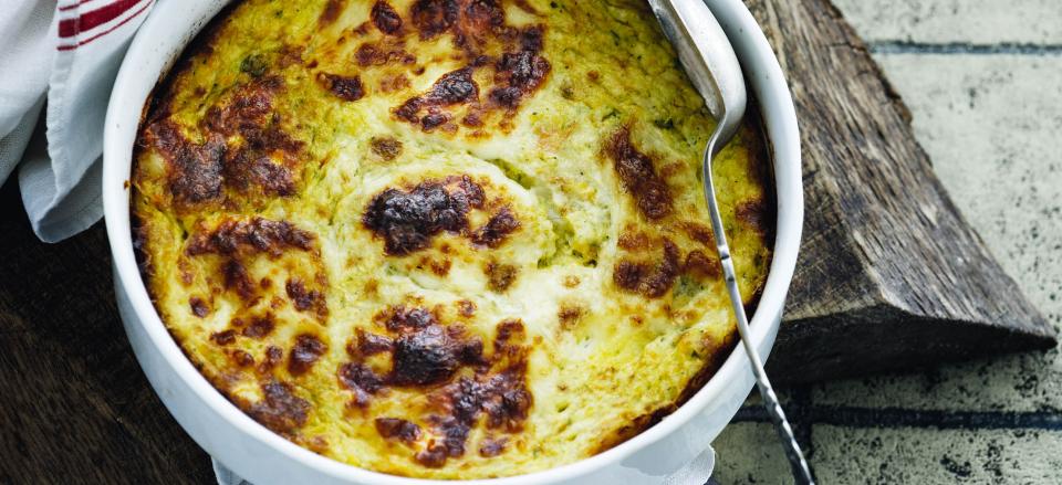 Skær 125 g mozzarella i små stykker og bland i grønsagsmassen, der placeres i et smurt ildfast fad, drysset med rasp.