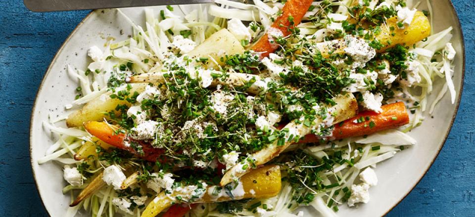 Ovnristede gulerødder og persillerødder med kærnemælksdressing og feta