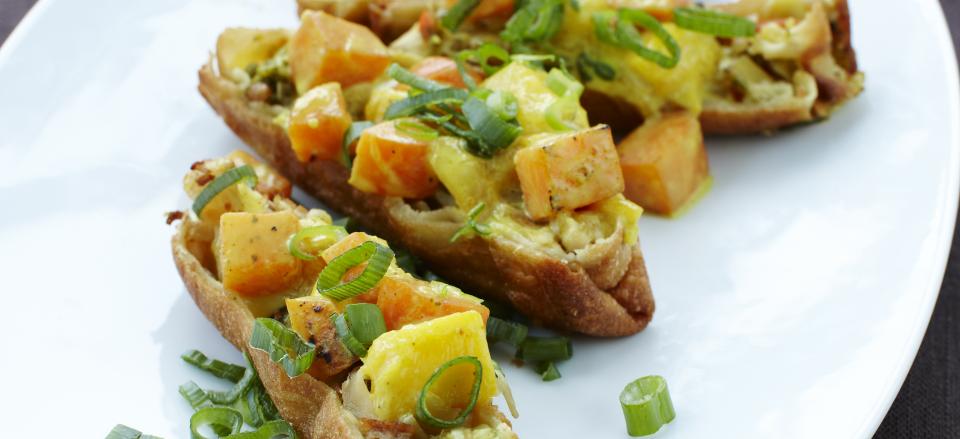 Ovnruller med kylling og karry krydrede grøntsager braiseret mango og gulerod i kokosmælk