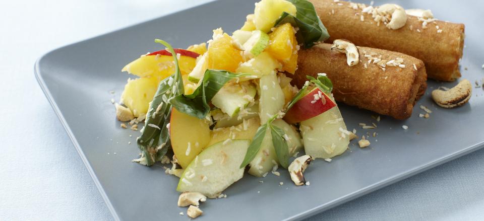 HjemOpskrifterOvnruller med kylling og kinesisk krydrede grøntsager Eksotisk frugtsalat med ristet kokos og røgede