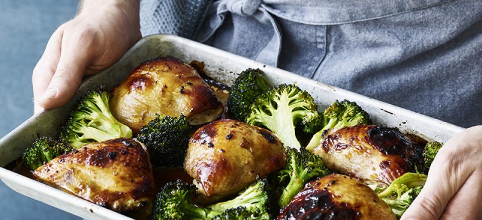Tag kyllingen ud af ovnen og kom broccolien i fadet.
