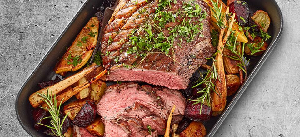 Ovnstegt kalveculotte med krydderurter og rodfrugter