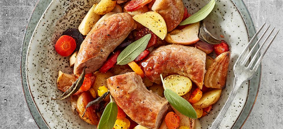 Krydr med salt og kværnet peber, og giv grøntsager og medisterpølse yderligere 25-30 minutter ved 200°C.