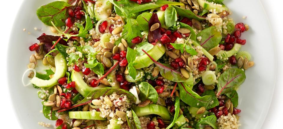 Halvér granatæble og bank på oversiden med en træske i en skål, så alle kerner falder ned i skålen.