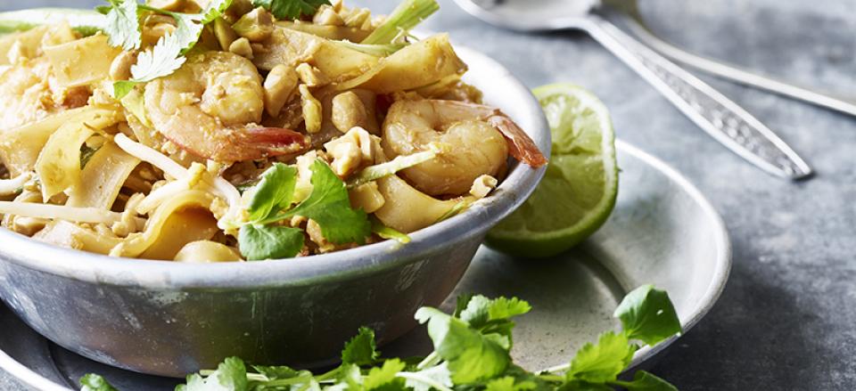 Bland så nudler og rejer sammen med det og tilsæt bønnespirer og grofthakkede peanuts.
