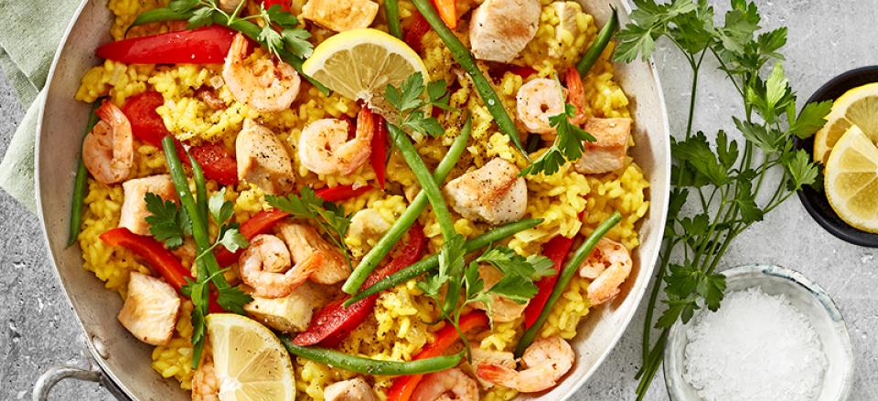 Paella med kylling, vannamei-rejer, friske bønner og persille