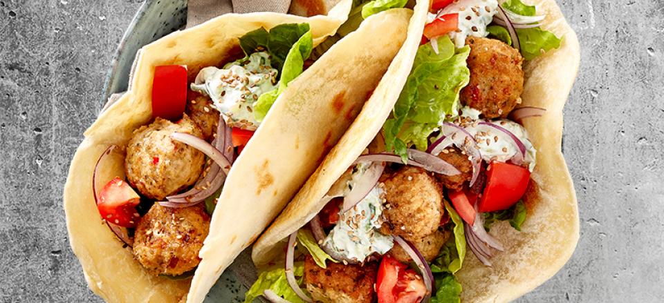 Serveringsforslag: Fold og fyld pandebrødene med kyllingekødboller og dit yndlingsfyld, fx hjertesalat, rødløg, tomater og ristede sesamfrø.