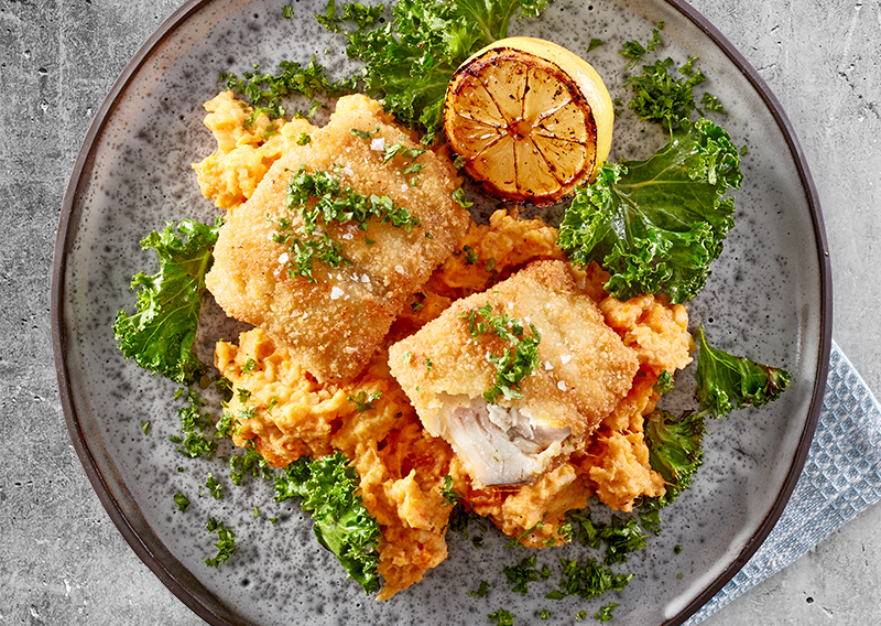 Anret rodfrugtmos med persilledrys, stykker af paneret mørksej og en halv brændt citron på 4 tallerkener.