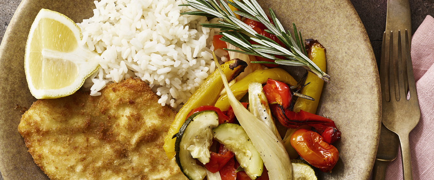 Paneret rødspætte med bagte grøntsager og ris