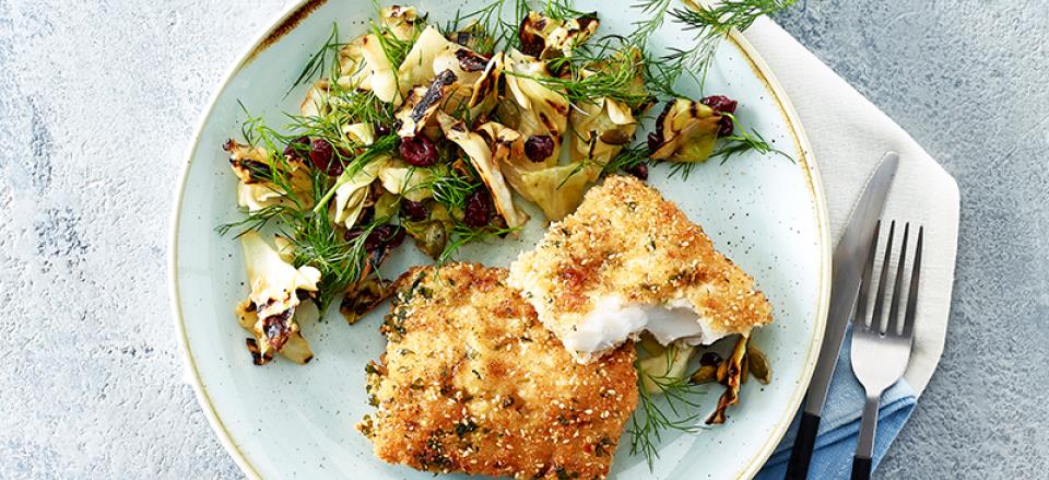Vend et torskestykke i æggeblandingen og derefter i raspblandingen.