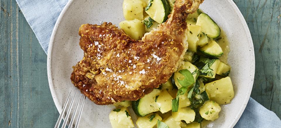 Vend kyllingen i mælk og melblanding og steg den i vindruekerneolie i ca. 10 min. pr. side.