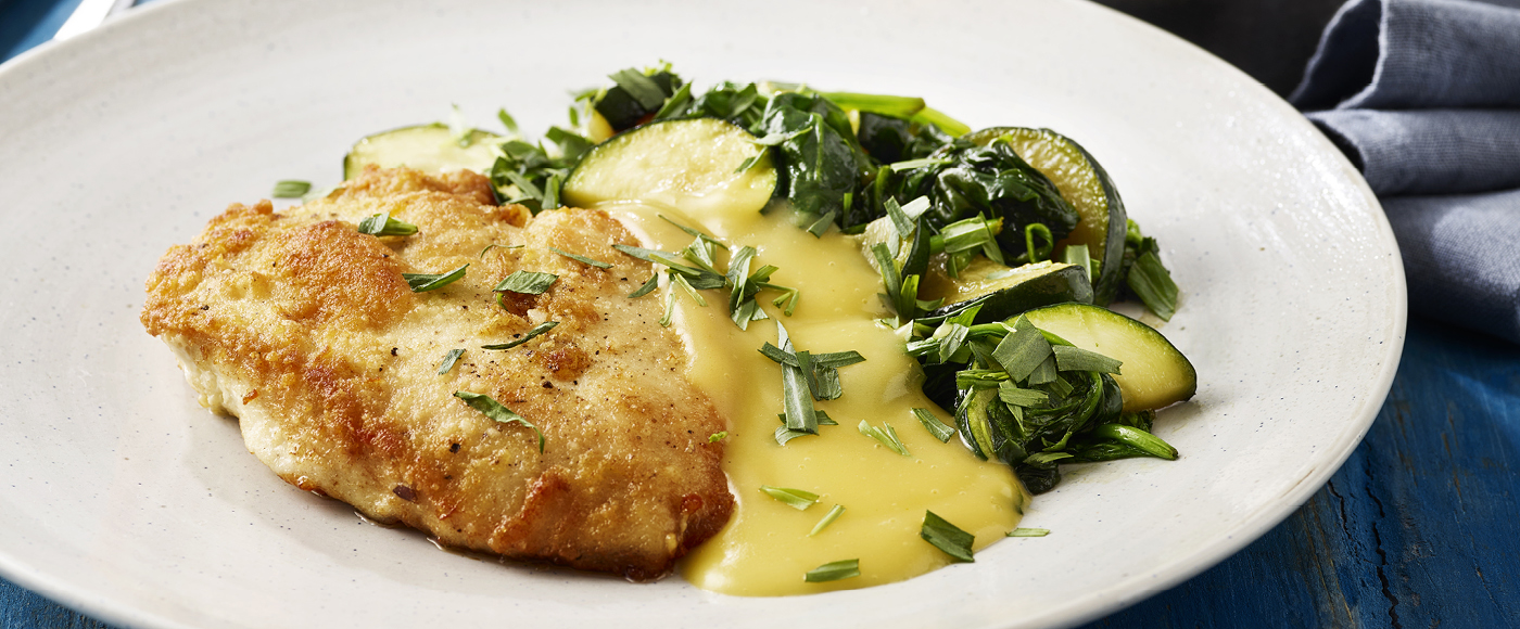 Parmesanstegt kyllingebryst med hollandaise og stegt grønt med estragon