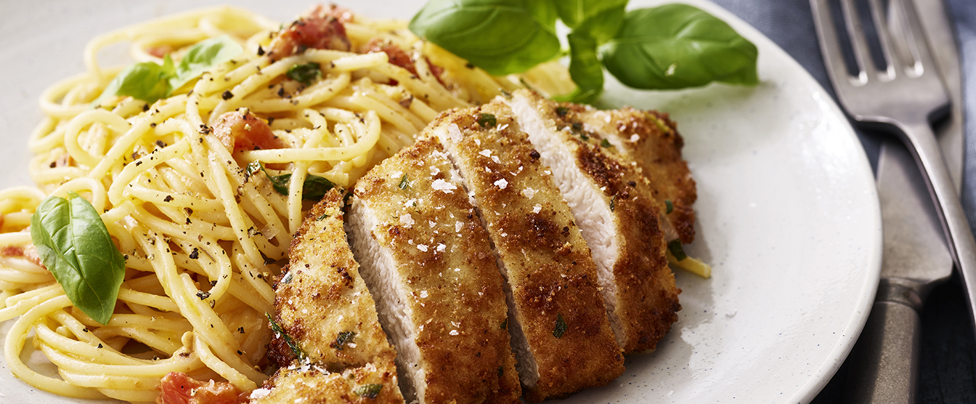 Parmesanstegt kyllingebryst og spaghetti med cremet tomatsauce