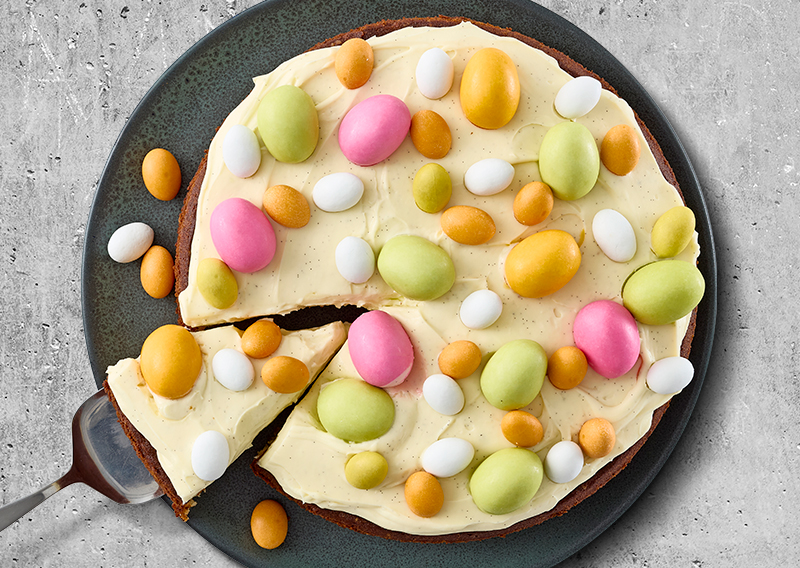 Smør cremen ud på kagen og pynt med små påskeæg i forskellige farver og størrelser.