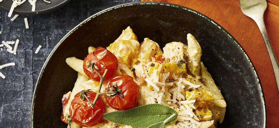 Pasta med bagt hokkaido, tomater, salvie og ricotta