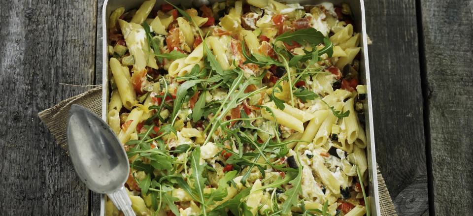 Kom pasta i fadet og vend det hele sammen indtil det er godt blandt.