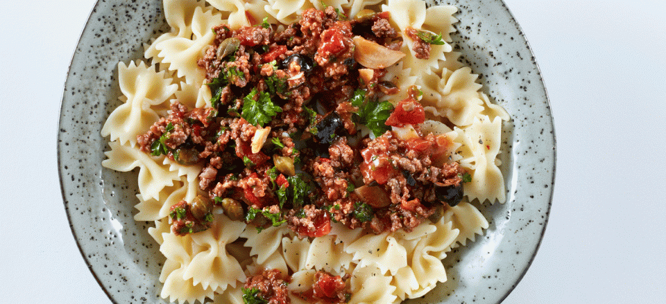Vend pasta og kødblanding sammen og servér i lune tallerkener.