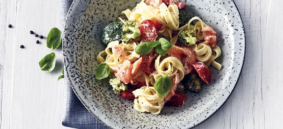 Vend cherrytomater, broccoli og strimler af røget laks i.
