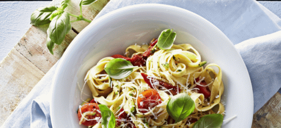Pasta med soltørrede tomater og squash