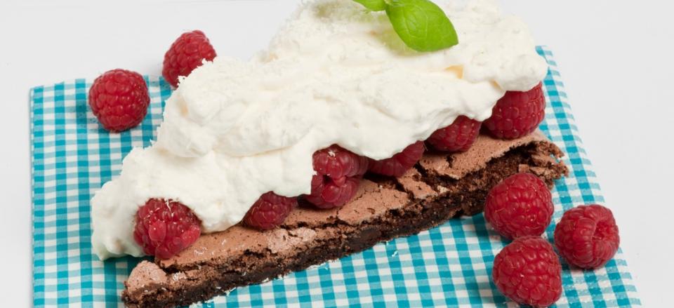 Et himmelsk ægteskab mellem sprød marengs med et blødt chokolade indre, saftige hindbær og lækker creme.