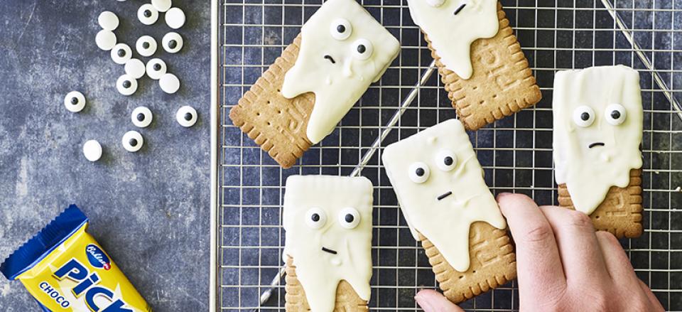Dyp kiksene i chokoladen, og pynt med øjne og krymmel som mund.