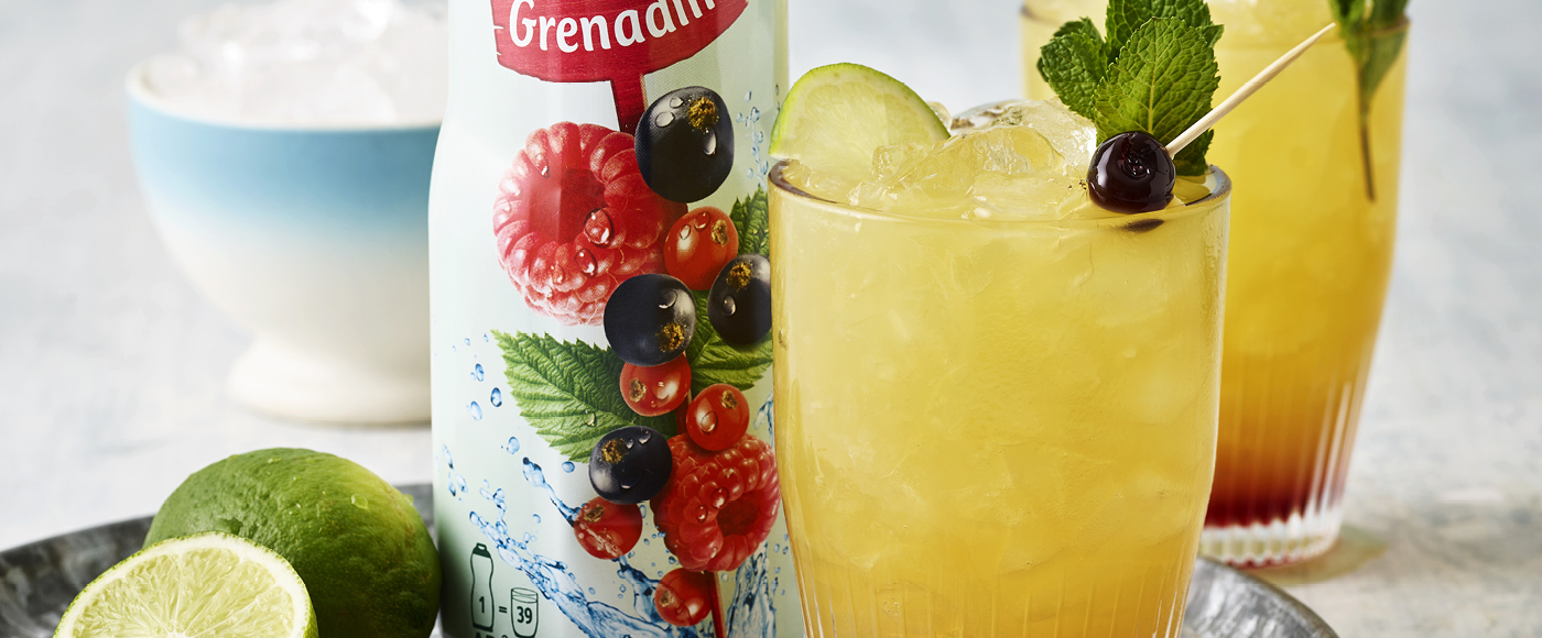Hæld grenadine i, så det lægger sig i bunden af glasset.