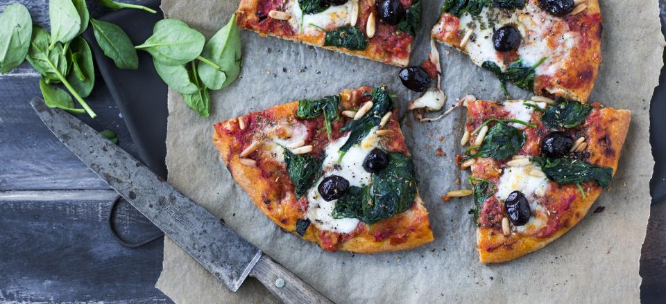 Pizza Aubergine med Spinat og Oliven