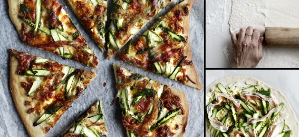 Læg pancettaen på pizzaerne og fordel der-efter aspargesene.