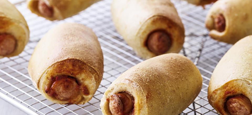 Knib dejen sammen og læg pølsehornene med lukningen nedad på to bageplader med bagepapir på.