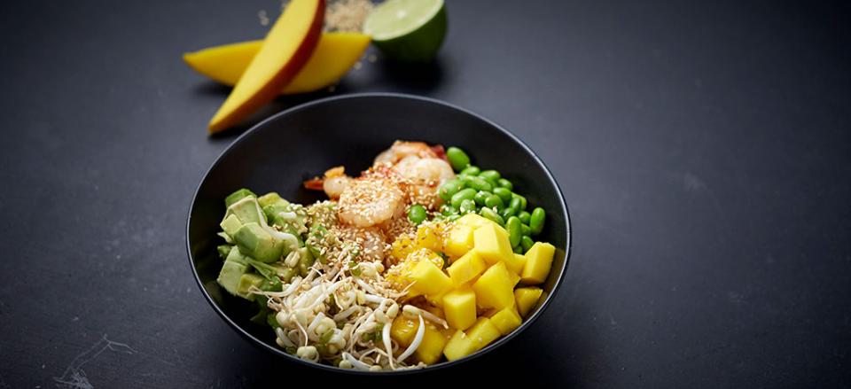 Kom de lune tigerrejer i en side, kom edamamebønner, avocado, mango og bønnespirer i skåle.
