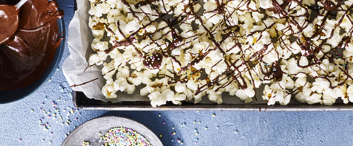 Popcorn med chokolade og krymmel