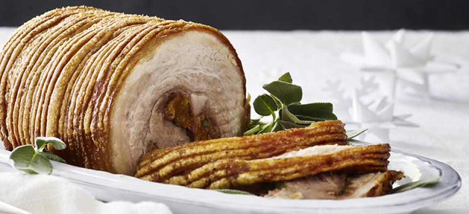 Krydr sværen med salt, og steg porchettaen ved 180°C i 1½ time.