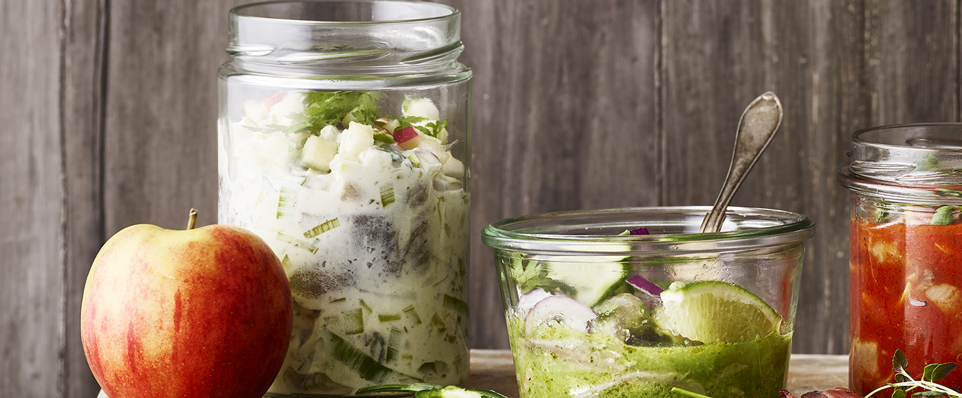 Vend sildene forsigtigt i marinaden, og lad det trække i køleskabet i en time.