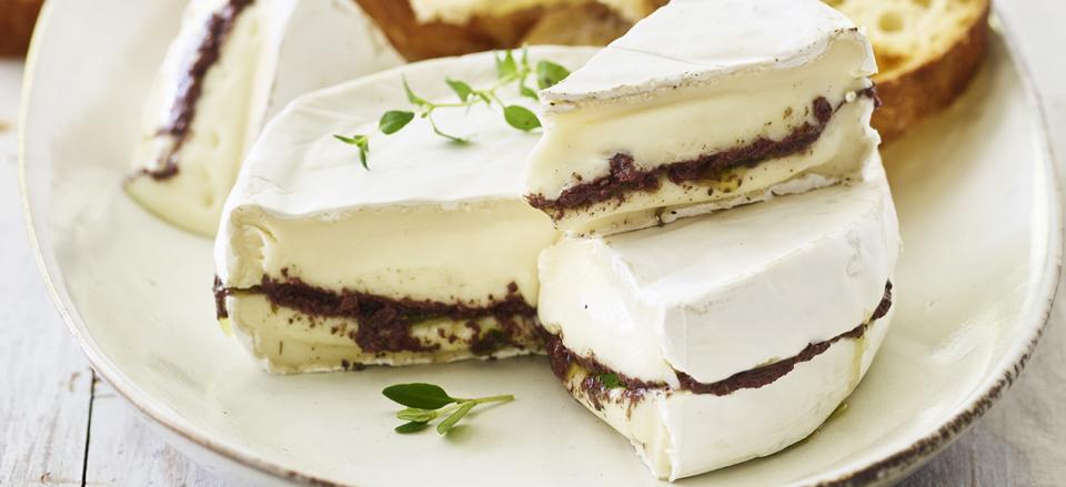 Tag brien ud af køleskabet, flæk den med en skarp kniv, og smør den nederste halvdel med tapenade.