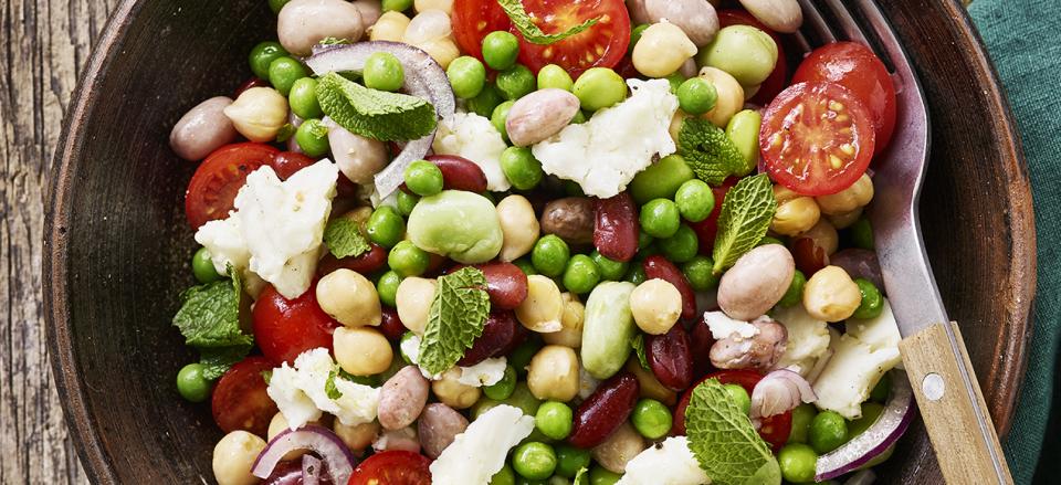 Bland det hele sammen med olivenolie, citronsaft og smuldret gedeost, og smag til med lidt salt og peber.