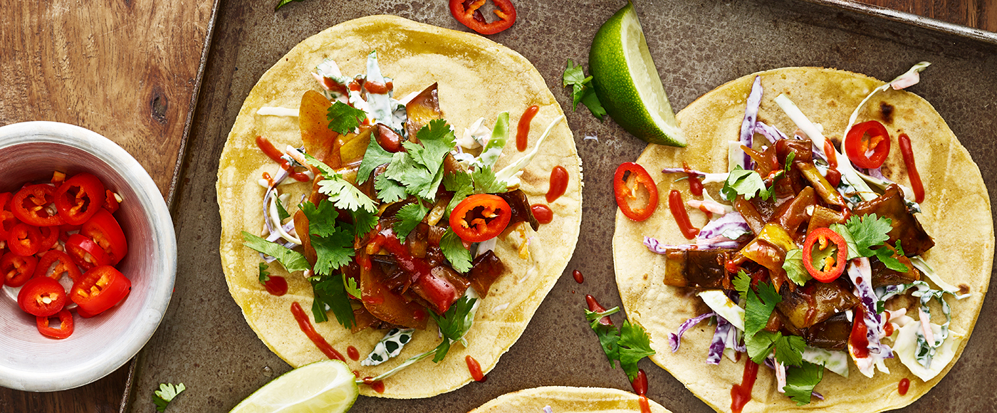 Servér bananskrællerne i tortillas med coleslaw, koriander, lime og evt. chilisauce.