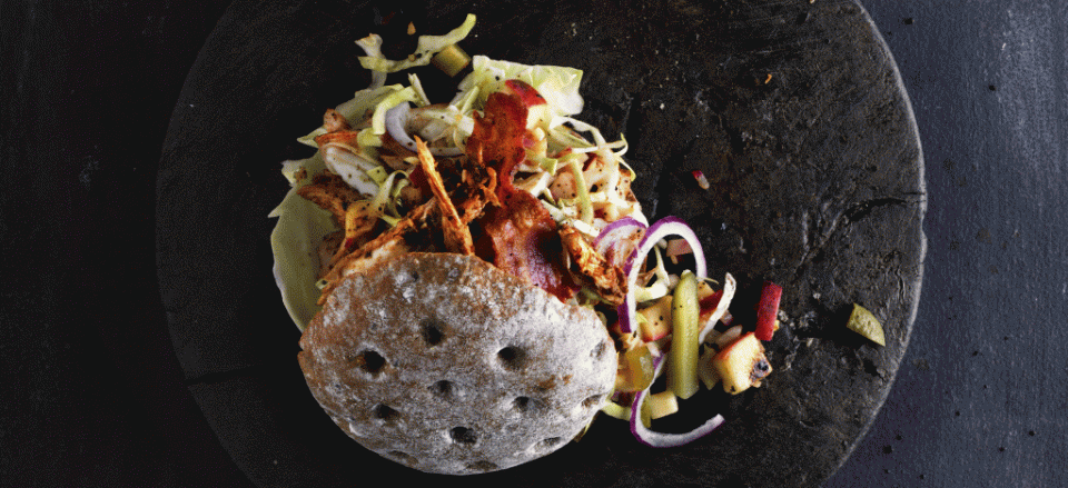 Kom æblerelish på brødet, så kylling, bacon, så lidt mere relish og til den sidste finish lidt spidskål/fennikel så det strutter af smag.