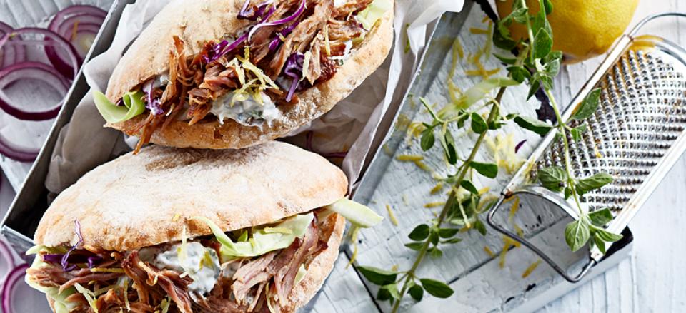 Anret pitabrød med pulled pork, tzatziki, rødløg og spidskål.